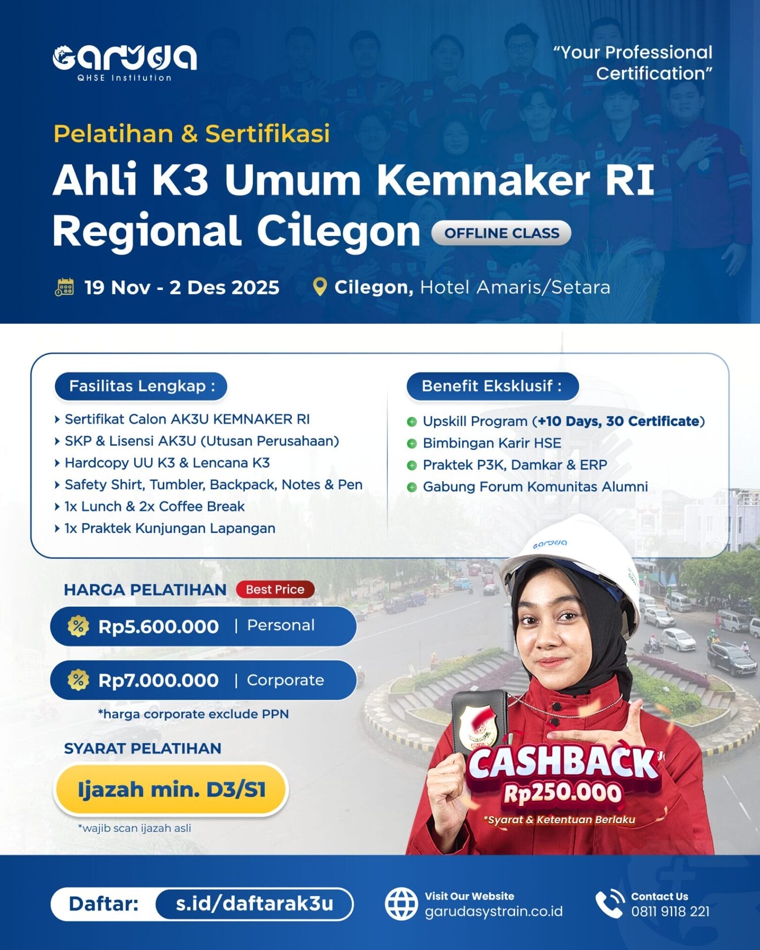 Jelas bahwa, mengikuti program pelatihan Ahli K3 Umum Cilegon merupakan investasi bagi setiap individu baik yang telah menjadi bagian dari Praktisi K3 (HSE Profesional) maupun bagi individu yang ingin menjadi bagian dari keluarga K3. Salah satu slogan yang sering kita dengar adalah “Safety is Everyone Responsibility” atau “Keselamatan merupakan tanggungjawab semua orang”. Slogan ini mengingatkan kita bahwa K3 merupakan kebutuhan semua orang sehingga tercapailah tujuan “Mulailah pekerjaan dengan semangat dan pulang dengan selamat.
