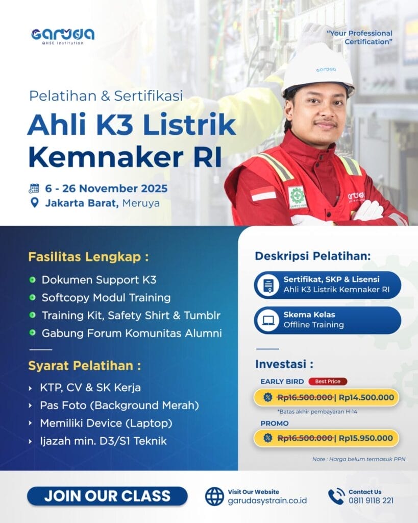 PT Garuda Systrain Interindo sebagai penyedia jasa Training and Certification memberikan pelatihan Ahli K3 Listrik sehingga membantu peserta dalam memenuhi standar kompetensi yang ditetapkan pemerintah.
