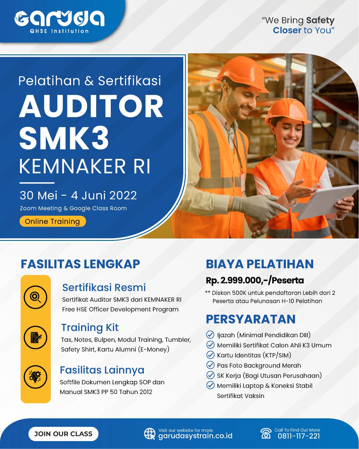 PT. Garuda Systrain Interindo menyelenggarakan Training Auditor SMK3 sesuai dengan Surat keputusan Dirjen Pembinaan Pengawasan Ketenagakerjaan kemnaker R.I No. Reg: 412/PJK3/F-MN/32/2021/P1 Tentang penunjukan PT. Garuda Systrain Interindo sebagai Perusahaan Jasa Keselamatan dan Kesehatan Kerja untuk jasa pembinaan K3 bidang Sistem Manajemen K3 dan Keahlian K3 Umum.