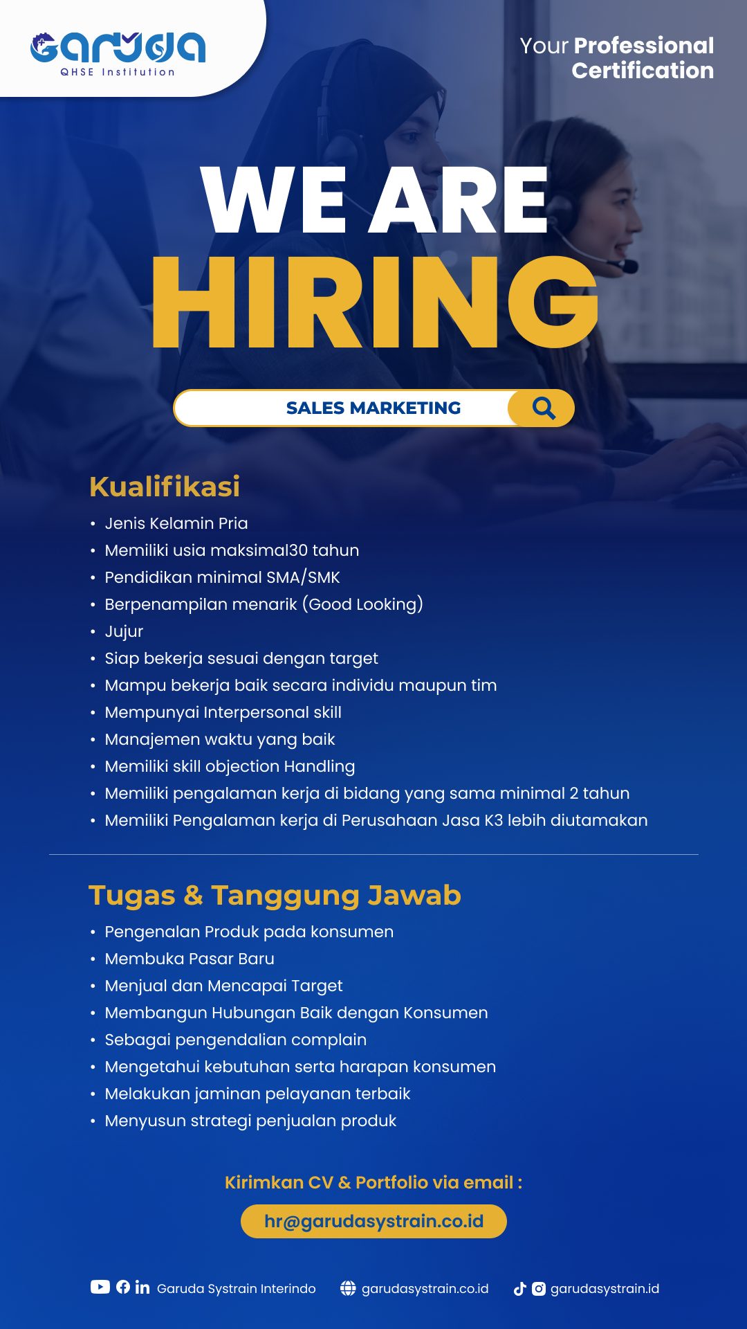 Kirim lamaran, CV & Video Perkenalan diri durasi minimal 1 menit ke email : [email protected]