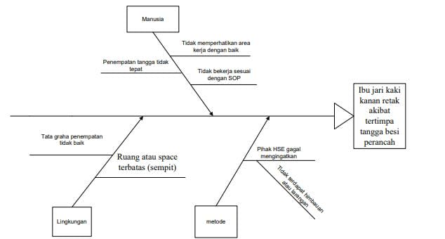 Pada kasus kecelakaan ini korban bernama xxx. Korban telah bekerja pada perusahaan ini selama 2 tahun. Kronologis kejadian kecelakaan adalah sebagai berikut, pada saat yang bersangkutan melaksanakan pekerjaan perbaikan kantor bengkel dengan menggunakan tangga besi perancah dengan berat kira kira sekitar 100 kg, secara tiba – tiba tangga tersebut meluncur kebawah ketika yang bersangkutan berada diatas tangga, sehingga tangga tersebut terjatuh mengenai kaki kanan yang bersangkutan. Kejadian ini mengakibatkan ibu jari kaki kanan korban mengalami retak. Berikut adalah tabel diagram Fish Bone nya