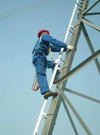 Pekerja yang melakukan perawatan atau perbaikan pada tiang listrik atau menara distribusi listrik menggunakan lifeline sebagai langkah keamanan.