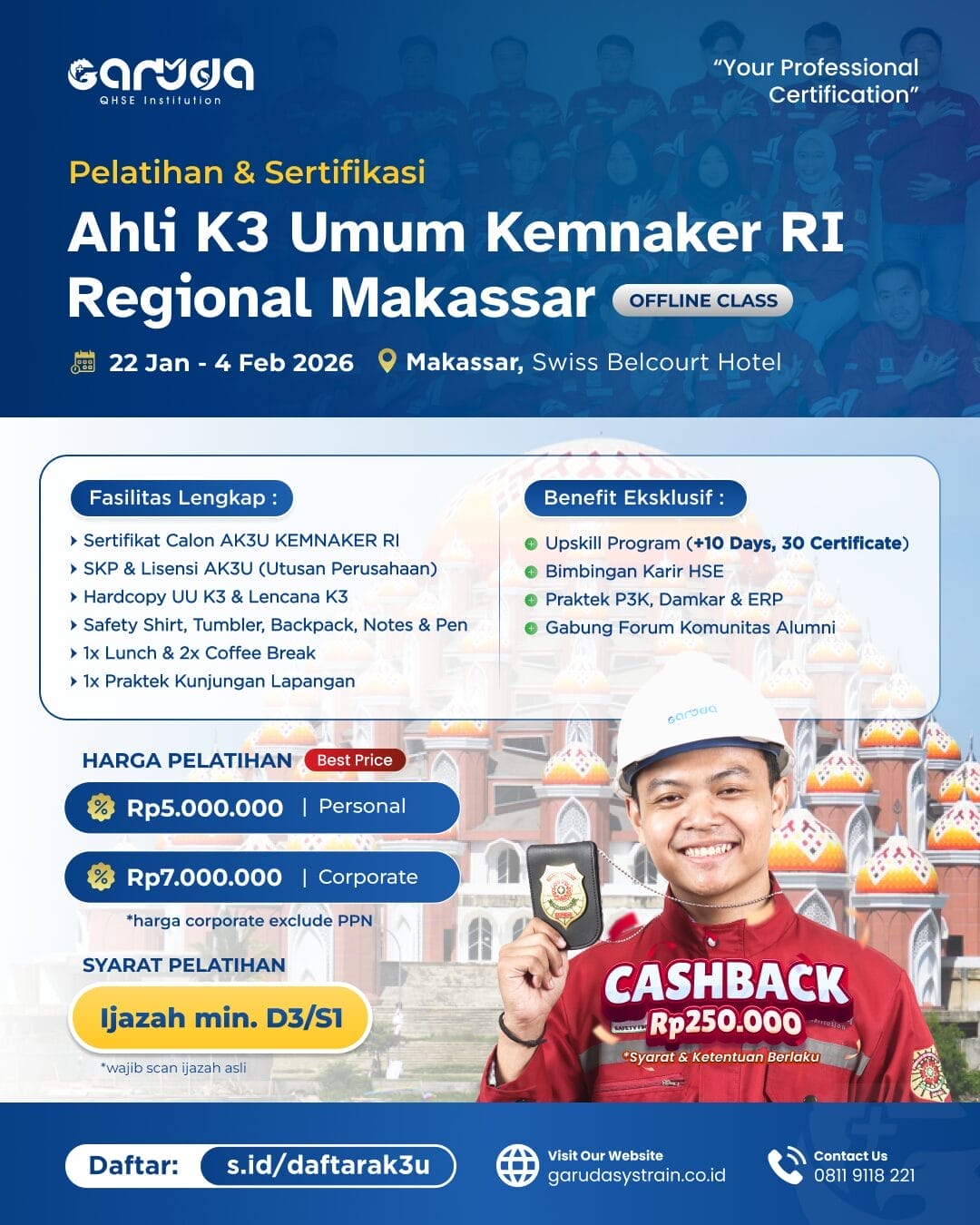 | 1 | Ahli K3 Umum | 15 – 29 Januari 2024 | Online Class | Daftar |