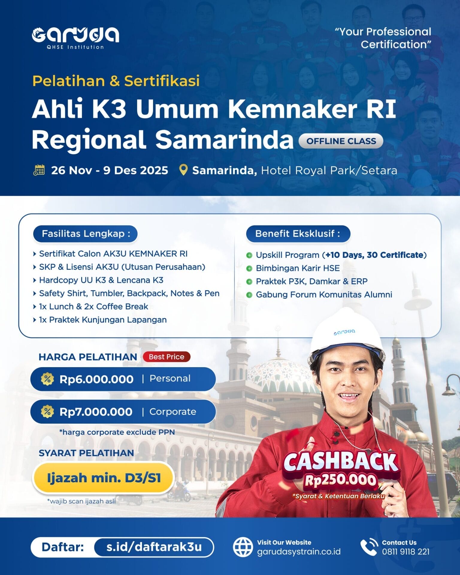 | 1 | Ahli K3 Umum | 15 – 29 Januari 2024 | Online Class | Daftar |