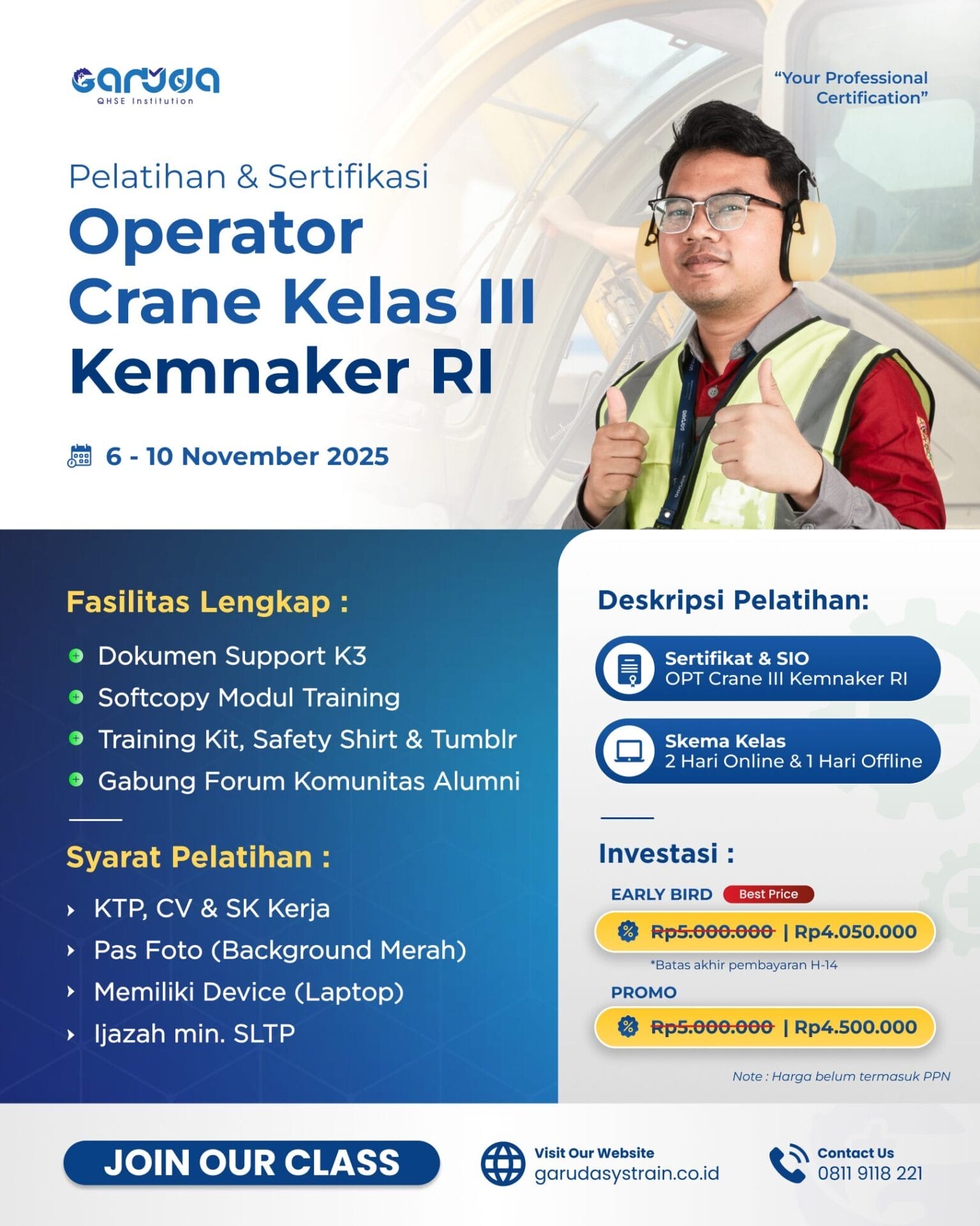 Jelajahi jadwal pelatihan Operator Crane Kelas III untuk menemukan sesi yang sesuai dengan kebutuhan Anda dan tingkatkan keterampilan Anda dengan pelatihan berkualitas!