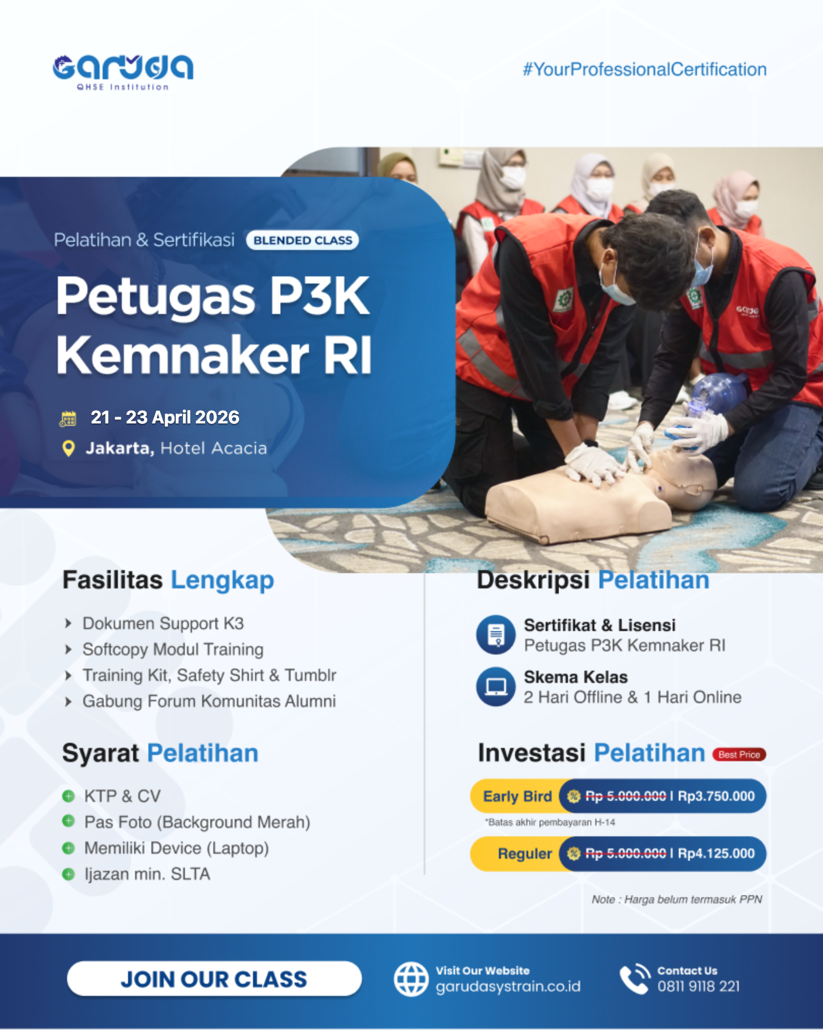 Pelatihan Pertolongan Pertama P3K adalah program yang dirancang untuk memberikan pengetahuan dan keterampilan penting dalam memberikan pertolongan pertama saat kecelakaan atau keadaan darurat di tempat kerja. Program Pelatihan P3K ini bertujuan untuk meningkatkan kesadaran akan pentingnya respons cepat dan tepat dalam situasi darurat, yang pada gilirannya dapat menyelamatkan nyawa dan mengurangi risiko cedera lebih lanjut. Dengan instruktur berpengalaman dan kurikulum terkini, peserta akan dipersiapkan dengan keterampilan praktis dan pengetahuan mendalam dalam bidang pertolongan pertama. Selain itu, sertifikasi resmi dari Kementerian Ketenagakerjaan Republik Indonesia (KEMNAKER RI) akan memberikan peserta keunggulan kompetitif dalam menghadapi tantangan di dunia kerja yang semakin kompetitif. Pelatihan P3K tersedia dalam format Blended Class dan Offline, dengan lokasi pelatihan di lebih dari 10 kota di seluruh Indonesia. Peserta akan diberikan Sertifikat Ahli Petugas P3K dari KEMNAKER RI setelah menyelesaikan program ini yang berlangsung selama 3 hari. Segera daftar Pelatihan P3K Garuda Systrain dan tingkatkan kompetensi kamu sekarang!