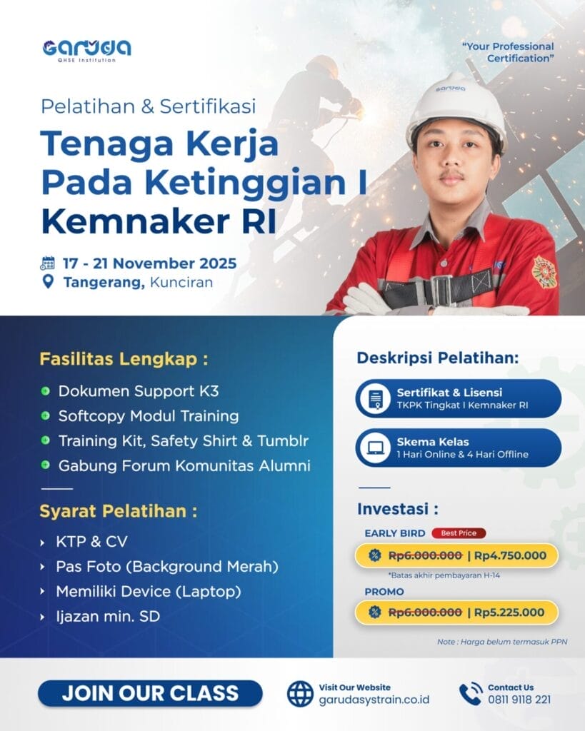 Pelatihan Tenaga Kerja Pada Ketinggian Tingkat 1 adalah program yang dirancang untuk meningkatkan keselamatan dan efisiensi pekerja yang beroperasi di ketinggian. Mengingat tingginya risiko kecelakaan seperti jatuh yang dapat berakibat fatal, pelatihan ini memberikan pengetahuan penting tentang penggunaan peralatan keselamatan, penilaian risiko, serta teknik bekerja yang benar di ketinggian. Selain memenuhi regulasi keselamatan kerja yang ketat, pelatihan ini juga membantu pekerja untuk lebih percaya diri dan produktif, serta membuka peluang pengembangan karier dalam industri yang memerlukan keterampilan khusus ini.