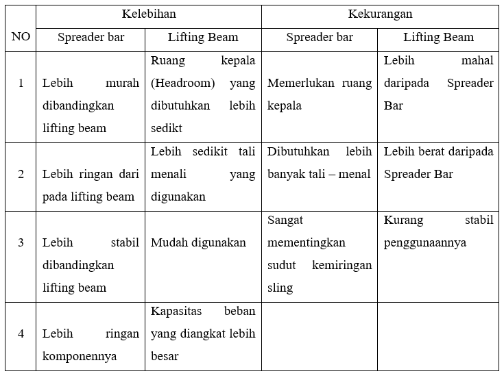Berikut ini adalah kekurangan dan kelebihan dari lifting beam dan spreader bar: