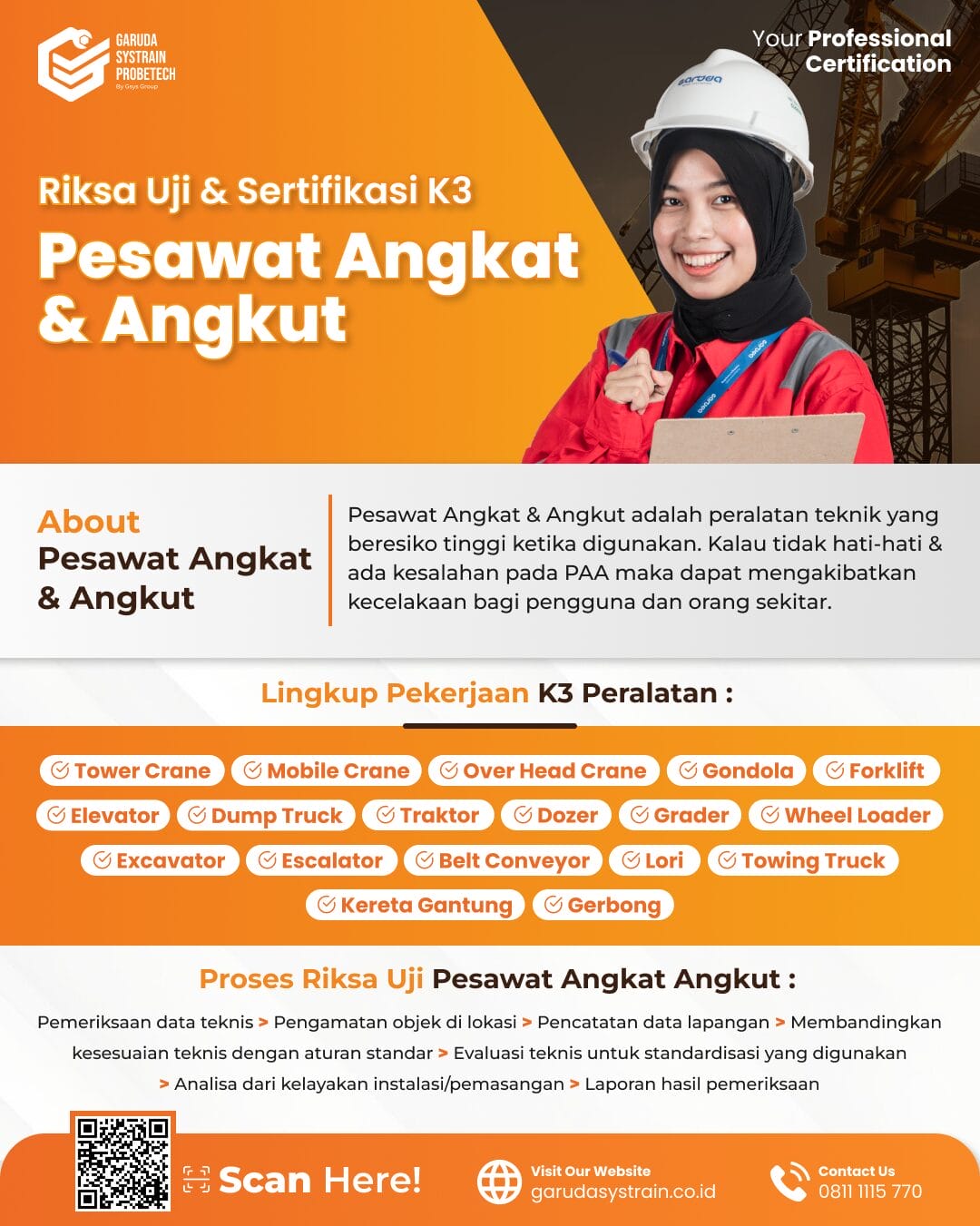 Tenaga ahli dan teknisi bersertifikasi kami menjamin bahwa semua riksa uji sesuai dengan standar industri terbaru, mengikuti peraturan terkini, dan memastikan alat di perusahaan Anda aman serta sesuai dengan peraturan yang berlaku.