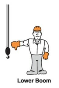 Raise the Boom and Lower the LoadAngkat lengan kanan setinggi bahu, luruskan ke samping dengan posisi tangan mengepal dan ibu jari menunjuk ke atas, lalu gerakan keempat jari mengarah ke dalam dan keluar hingga gerakan beban sesuai yang dikehendaki.