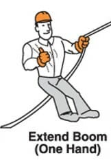 | Extend Boom (One Hand) | Jenis isyarat ini hanya dilakukan dengan satu tangan apabila tangan lain sedang memegang barang yang diangkat atau tali kendali. Extend boom ditandai dengan mengarahkan ibu jari ke badan signalman sendiri. Aba-aba ini hanya digunakan untuk tipe telescopic crane. | ![]() |