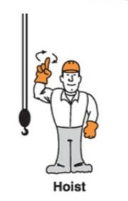 | Hoist | Angkat lengan membentuk siku-siku dengan posisi jari telunjuk ke atas sambil tangan diputar searah jarum jam. Isyarat ini digunakan pada proses pengangkatan barang/beban. | ![]() |