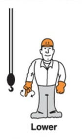 | Lower | Angkat lengan membentuk siku-siku dengan posisi jari telunjuk menunjuk ke bawah sambil tangan diputar searah jarum jam. Isyarat ini digunakan pada proses penurunan barang/ beban. | ![]() |