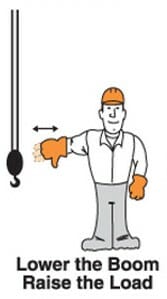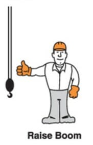 | Raise the Boom and Lower the Load | Angkat lengan kanan setinggi bahu, luruskan ke samping dengan posisi tangan mengepal dan ibu jari menunjuk ke atas, lalu gerakan keempat jari mengarah ke dalam dan keluar hingga gerakan beban sesuai yang dikehendaki. Gerakan ini bisa juga dilakukan dengan mengangkat lengan kanan setinggi bahu, luruskan ke samping dengan posisi tangan mengepal dan ibu jari menunjuk ke atas, sedangkan lengan kiri angkat membentuk siku-siku dengan posisi jari telunjuk menunjuk ke bawah sambil tangan diputar searah jarum jam. Isyarat ini berarti operator harus menaikkan boom dan menurunkan beban. | ![]() |
