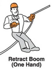 | Retract Boom (One Hand) | Aba-aba ini hanya digunakan untuk tipe telescopic crane. Restract boom ditandai dengan mengarahkan ibu jari ke crane atau operator dan tangan lainnya memegang barang yang diangkat atau tali kendali. | ![]() |