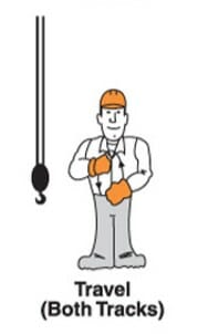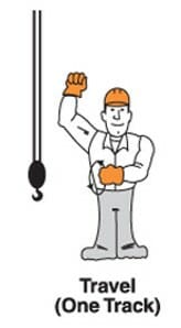 | Travel (One Track) | Isyarat tangan ini hanya digunakan untuk crawler crane. Angkat lengan membentuk siku-siku dengan posisi tangan mengepal , lalu lengan lainnya diangkat setinggi pinggang dengan posisi tangan mengepal sambil diputar mengarah keluar. | ![]() |