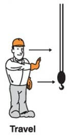 | Travel | Ada kalanya posisi crane kurang pas dengan keinginan juru ikat (rigger). Untuk itu, diperlukan gerakan berpindah agar sesuai dengan posisi yang dikehendaki. Kedua lengan diangkat ke depan setinggi bahu dengan kedua telapak tangan di buka posisi seperti mendorong. Artinya, crane harus bergerak mundur atau maju sesuai perintah. | ![]() |