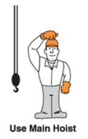 | Use Main Hoist | Isyarat tangan ini digunakan khusus untuk crawler, truck, dan locomotive crane. Angkat lengan tepat di atas helm dengan posisi tangan mengepal sambil mengetuk helm, selanjutnya lakukan isyarat tangan lain untuk melanjutkan aktivitas pengoperasian crane. Gerakan ini memiliki arti agar operator crane menggunakan hoist utama. | ![]() |