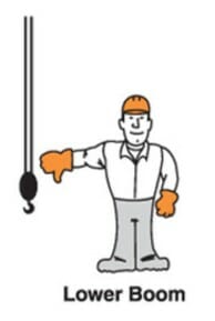 | Lower the Boom and Raise the Load | Angkat lengan kanan setinggi bahu, luruskan ke samping dengan posisi tangan mengepal dan ibu jari menunjuk ke bawah, lalu gerakan keempat jari mengarah ke dalam dan keluar hingga gerakan beban sesuai yang dikehendaki. Gerakan ini bisa juga dilakukan dengan mengangkat lengan kanan setinggi bahu, luruskan ke samping dengan posisi tangan mengepal dan ibu jari menunjuk ke bawah, sedangkan lengan kiri angkat membentuk siku-siku dengan posisi jari telunjuk menunjuk ke atas sambil tangan diputar searah jarum jam. Isyarat ini berarti operator harus menurunkan boom dan menaikkan beban. | ![]() |