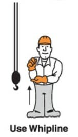 | Use Whipeline | Angkat lengan kanan setinggi pinggang dan posisikan lengan ditekuk menyiku, lalu gerakan telapak tangan kiri menyentuh siku lengan kanan secara berulang-ulang. Isyarat ini memberikan petunjuk agar operator crane menggunakan whipline atau auxiliary hoist. | ![]() |