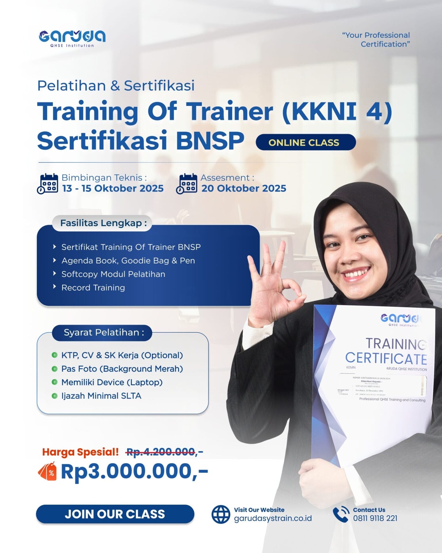 Kami didukung oleh instruktur berpengalaman dan bersertifikat di bidang Training of Trainer, yang telah terbukti kompeten dalam merancang, mengelola, dan menyampaikan pelatihan berkualitas tinggi untuk pengembangan kapasitas para trainer, sehingga mampu menjamin proses pelatihan yang bermutu, aplikatif, dan berorientasi pada hasil. Sedangkan untuk assessment akan di lakukan oleh Asesor dari LSP Pelatinas