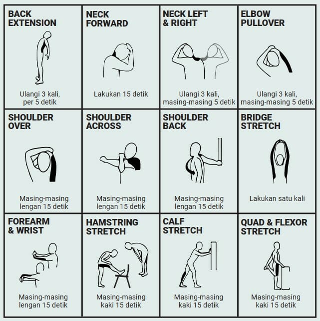 Setelah mempraktekkan posisi kerja yang sesuai, bekerja dalam waktu yang lama akan beresiko menimbulkan cedera tulang dan otot. Peregangan dapat mengurangi risiko tersebut dan hanya membutuhkan waktu 5 – 10 menit untuk melakukannya tanpa berpindah dari tempat kerja. Peregangan dapat dilakukan dengan cara seperti gambar dibawah: